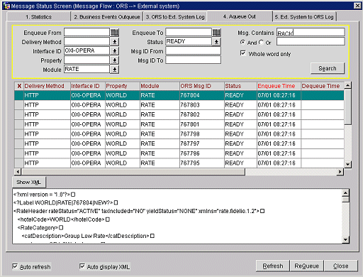 This screen displays the next level in the live cycle of a message from ORS to the external system. The additional information in this screen is minimal. If a reservation message goes into failover in OXI_HUB, only the next delivery attempt will be visible on the Aqueue Out status screen.