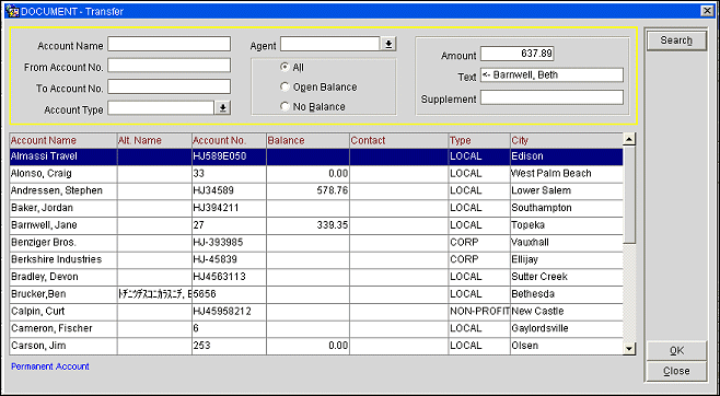 This screen allows you to select the target account to transfer the invoice or payment to. Use the search criteria to narrow the display of AR accounts. Highlight the target account of your choice. To perform the transfer, select the OK button. A message appears asking you to confirm your decision: "Are you sure?". Select the Yes button to proceed with the transfer. The transferred invoice or payment now appears on the Account Maintenance screen of the account to which it was transferred.