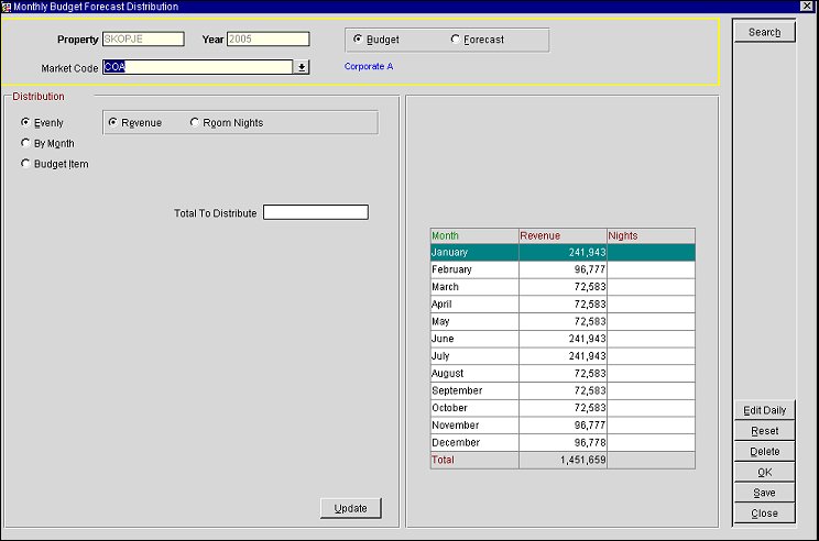 Edit Daily. Displays the Daily Budget Forecast Distribution screen from which the monthly budget entered can be further adjusted and distributed.