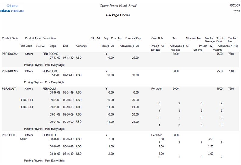 Note: When the Rates>Package Pricing and Availability Attributes application function is set to Y, this report will display the Package detail records and will include the Min/Max attributes that have been configured.