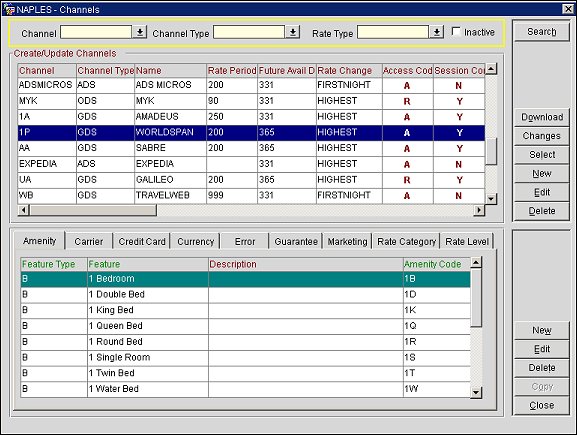 The Channels Setup screen allows you to configure the various channels used to sell a property's inventory through third parties such as a travel agent on a global distribution system (GDS), or an Internet portal such as Expedia on an alternate distribution system (ADS). The channel you set up here is associated with the GDS/ADS host. Some of the most popular GDSs, ADSs, and switches are already configured for you and can be turned into an OPERA channel by selecting the Select button (only minimal configuration is required thereafter).