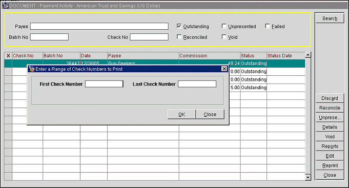 Note: To reprint a check that is statused Unpresented, you must first change the check status from Unpresented to Outstanding so that it appears on this screen. See Payment Activity for details.