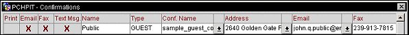 The primary fax and primary email addresses are automatically displayed on the Confirmations screen for sending confirmation/reservation update/cancellation letters. For added convenience, OPERA offers a further option. When you select a fax or an email address as the Primary, the Default Communication Method check box appears (see below). Use this option to indicate that the address should be pre-selected for sending confirmation letters to this profile. A sample Confirmation screen is shown below. The Fax address and Email address shown for the guest have both been designated as the Primary addresses for these roles on their respective Communication Information screens (although there may be other addresses having the same communication roles). In addition, the Default Communication Method check box on the Communication Information screens for these addresses has been selected. We know this because there is an X, by default, in the Email and Fax fields to the left of the guest's name when we open the Confirmations screen. (These choices can be un-selected if you decide not to send the email and/or fax confirmations to the guest.)
