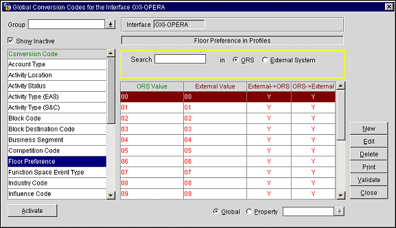 You can find out if you are in Global mode by checking the toolbar on top of the screen – it should read Global Conversion Codes for the Interface OXI-OPERA, OXI-V6, OXI-V7 etc. Further, global default values are shown in RED text.