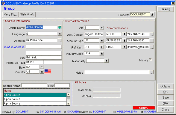 This profile is used for businesses with which the property has commercial dealings. This category might include businesses who sponsor guests, businesses for which your property handles events, or companies who directly provide products or services to your property or chain. Sources (of business) and travel agents are special kinds of businesses that have their own profile types, although in all essential respects source and travel agent profiles are identical to the company profile type. For this reason, you will see the title "Account" on the profile screen of a profile belonging to a company, an agent, or a source.