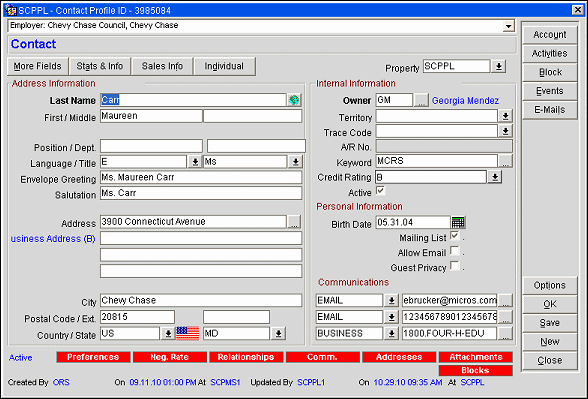 Note: Properties may use the OPERA Screen Painter feature to add and modify fields on the main Profile screen and on the More Fields tab. This means that your Profile screen may include additional fields, restrictions on field use, different order of fields, and different layouts from those described here. See your manager if you have questions regarding specific changes made at your property.