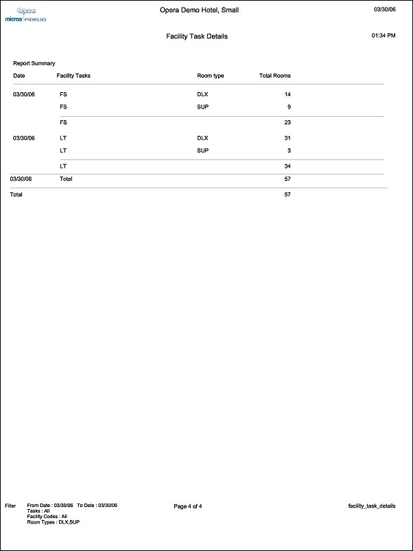 The Facility Task Details report displays all reservations, checked in and checked out, that have facility tasks assigned. When printing the full report, it is broken down by Facility Task and also displays a Facility Task Summary at the end.