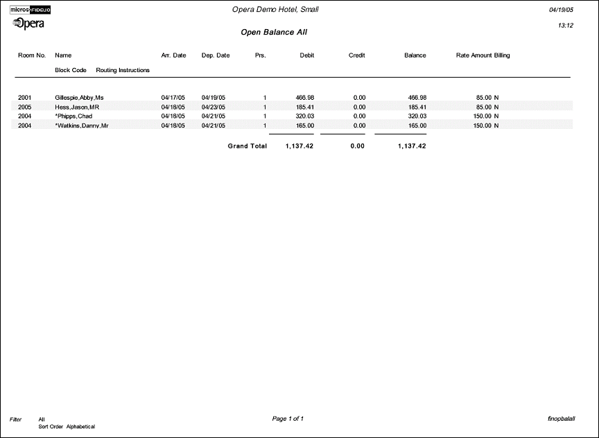 The Open Balances All Report displays the current balance on Reservations or Blocks. This also includes advance deposits. This report could be useful when included as a downtime report.
