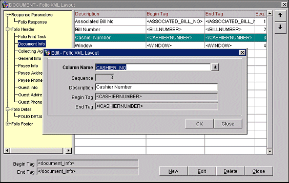 Select columns from the Response group in the  tree view in order to add and edit elements in the response XML file. Select columns from the Folio Header, Folio Detail, and Folio Footer groups in the tree view in order to add and edit elements to the folio XML file. When you select a group, the enclosing XML tags for the elements in that group are shown for reference in the Begin Tag and End Tag fields in the lower part of the screen.