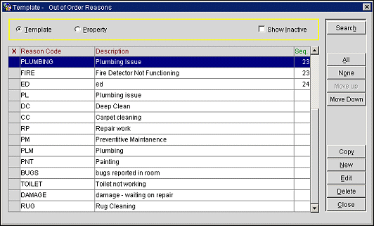 The Template screen is automatically displayed when you open a code, reason or locator set that can be distributed to other properties. The grid titles are displayed in red. Click the column heading you want to sort by. When you have sorted the results by a particular column, the column heading will display in green. The grid will show a list of all the standard codes you have entered that are available for all properties. This template gives you the ability to administer codes for multiple properties with the following functions: