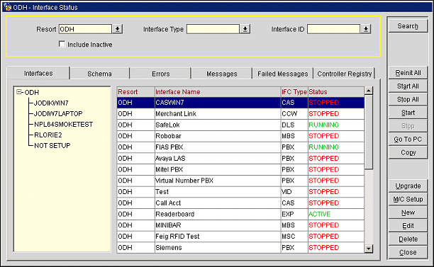 Stop All. Select this to stop all interfaces for that resort only. When selected, a message prompt is displayed to verify that the user wants to stop all the interfaces for the resort. When the task is completed, the Status will display as STOPPED for the interfaces that have been stopped.