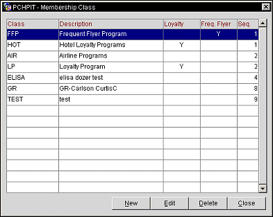 Membership Classes are used to classify Membership Programs. They can be identified as Airline Programs (Frequent Flyer Programs) or Loyalty Programs (Property Guest Loyalty Programs). Before the Membership programs can be created in Configuration > Profiles > Memberships > Types you must define the Membership Class that the program belongs to. Select Configuration > Profile > Memberships > Classes to display the membership classes that have been configured.
