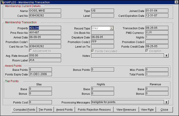 Use these buttons to display additional information related to the current membership points transaction. This information can be useful when researching questions related to points transactions.