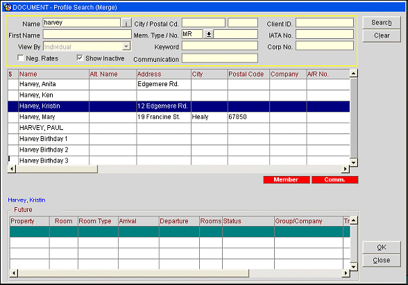 If you leave the Name and First Name fields blank (i.e., a null value), and select the Member Number/Corp ID/IATA Profile option, OPERA will display all profiles that have matching values entered in the profile for Membership Number, Corporate ID, and/or IATA Number regardless of the name. If you enter name information (Name and/or First Name, full or partial) and then select the Member Number/Corp ID/IATA Profile option, all profiles with a possible match on both name and Membership Number, Corporate ID, and/or IATA Number would be displayed; blanks (i.e., null values) in the profile for Membership Number, Corporate ID, and/or IATA Number constitute a match.