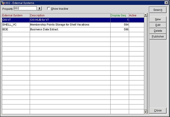 Select the property from the list of values in the Property field and then select the Search button to view all external systems configured for a particular property. Select the Show Inactive check box to display all inactive external systems. To create new or edit existing external systems, select the New or Edit button. The following screen appears: