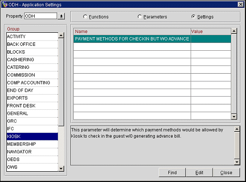 To view the available payment methods at the Kiosk, select the Payment Methods For Checkin But WO Advance Bill Option setting, and select the Edit button.