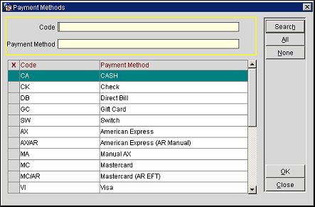 From this screen, you can search for available payment methods and select acceptable payment methods. To mark a payment method as acceptable, place an X in the X column. You can mark all payment methods by selecting the All button, or un-mark all payment methods by selecting the None button.