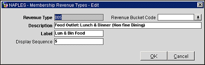 Revenue Bucket Code. This is a pick-list of configured Revenue Buckets. Link the correct bucket to the Membership Revenue Type based on Room, Miscellaneous, Food and Beverage etc.