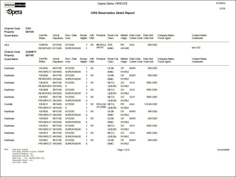 The ORS Reservation Detail Report shows all reservations made through ORS for a property within the selected date range, using other search criteria. The report organizes the information by channel code, property, and guest name.