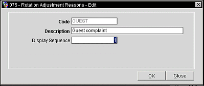 Edit. Select to display the Rotation Adjustment Reasons screen and edit the highlighted rotation adjustment reasons code.