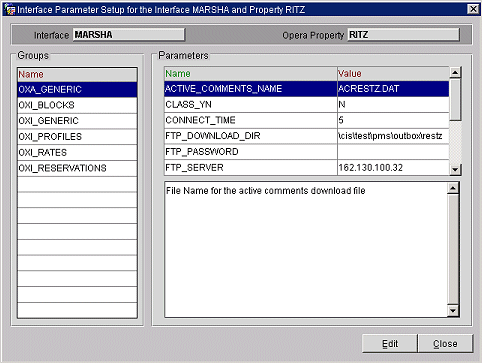 To set the basic functionality parameters for your interface, go to Interface Configuration>Parameters. Select the group of parameters on the left side of the screen. The right side of the screen shows the list of parameters associated with that group. To modify a parameter, highlight it and press the Edit button. The edit screen will allow you to change the value. To see the entire description of a parameter, select the button next to the Description column.