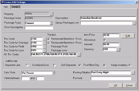 In this scenario the guest spent $24.00 for breakfast. The allowance was up to $50.00 but the item price was $25.00. OPERA posted a Package Profit of $1.00 in this case.
