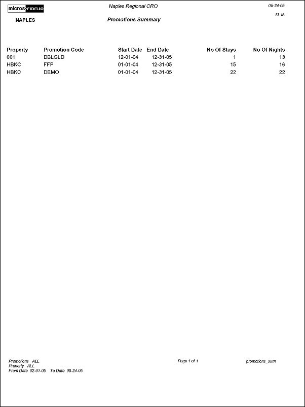 The Promotions Summary report provides a view of the number of stays associated with a promotion code, at a property, within a time range.