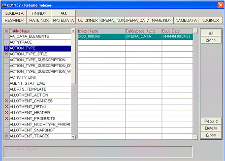 Rebuild Indexes is a menu option located in Utilities>Tools>Rebuild Indexes. All the tables with the respective index will be marked after step 20 is completed. To start the rebuild, simply click on the rebuild button. A password is needed to start the index rebuild. The password is provided to clients as needed by Oracle (currently controlled by development).