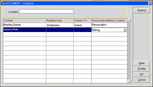 The Reservation/Billing Contacts screen shows all profiles defined as having a relationship with the guest profile and/or any of the company, travel agent, group or source profiles which are attached to the reservation. (Contacts are set up using the Profile screen of the entity — individual, company, travel agent, source, group) with which the contact is associated.)