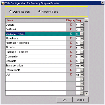 The Tab Configuration for Property Display Screen provides users the opportunity to configure the "Define Search" labels and the "Property Tab” sequence that will display on the Sell Screen Define Search and Property screens. The Tab Configuration for Property Display Screen is accessed from the Configuration screen>Sell Setup button.
