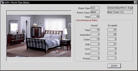 Housekeeping Status. Number of vacant and occupied rooms that are Clean, Dirty, Out of Order, and Out of Service.