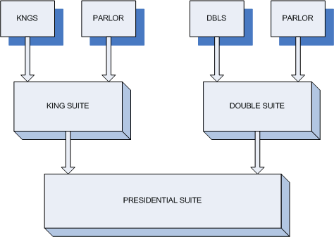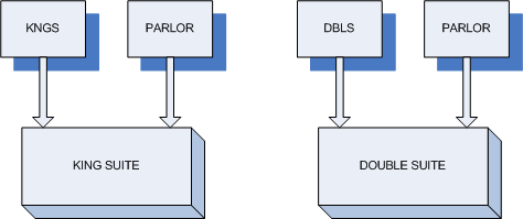 A component room could be made up of the TK and CK room types even though these room types belong to different room classes. The room class of the resulting component room can be the same as either of the room types, or a completely different room class. When reporting for the component room, the room class associated with the Component Room room type will be used, rather than the room classes of its elements.