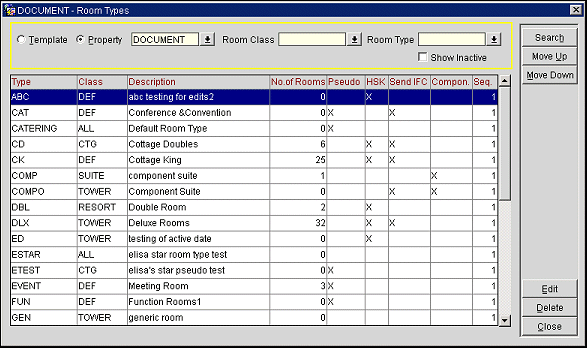 Show Inactive. Available when the Property option button is selected. Select this check box to display inactive room types for the property. Room types may be set to inactive at the property level only if there is no inventory available for that room type, for example. The same validation checks for deleting a room type remain in effect for inactivating a room type. These include the following: the room type cannot be associated with a rate code; it cannot be associated with a current and/or future reservation; it cannot be associated with an active business block; it cannot have room numbers associated with it; and it cannot be part of a component room type configuration. (Inactive room types will not display as an option when you select the Room Type LOV on the Reservation screen, when viewing the Rate Query Details screen, or when accessing the Room Grid from within the Business Blocks module.)