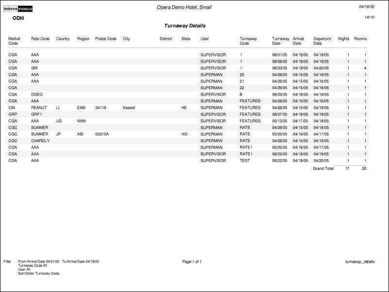 The Turnaway Details report displays the details for each turnaway in a group-by format. The report can be filtered on either the stay date or turnaway date. This report is available when the Reservations > Turnaways application function is set to Y.